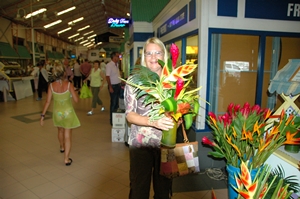 The next stop was Barbados, where we took a nice shore excursion. On the way back to the ship, my wife bought a nice flower arrangement in a bamboo vase for ten dollars!!! Have a look at the photo when she holds it and when it decorates our desk on the ship.