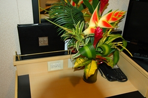 | Flower arrangement in cabin on desk | Flower arrangement in terminal in Barbados |